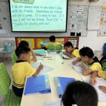 It starts with choosing a simple, age-appropriate story. We read together as a class, following along with the teacher and learning new words. We talk about the pictures and make exciting guesses about what might happen next. To check our understanding, our teacher asks us questions about the story, and we complete a simple worksheet to consolidate the details.