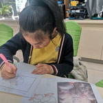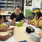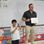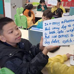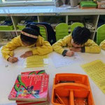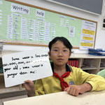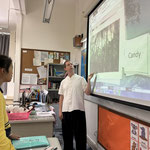 In our writing classes, we have been focusing on adding adjectives and details in our stories. Our students are often given a variety of prompts from pictures, videos, to sentences. As a class, we do a pre-writing exercise to help bring out creativity or to give students new vocabulary. The students then work on writing a first draft of their story. As the students are writing the stories, the teachers and the TA go around the room and work with tables to help them develop their ideas or point out mistakes and giving advice on how they can improve their writing. After the students have finished their first draft, we will work on some editing exercises as a class. Some exercises, like this month, we focused on adding detail to our sentences with vocabulary that we have studied in class, while other exercises were used to help students notice mistakes in their writing. The teacher used sample sentences from the students’ stories and together we fixed the mistakes on the board. Afterwards, students used colored pencils to fix their own mistakes in their writing. Students are not expected to be able to find all the mistakes in their writing but will be able to find some, especially with the help of the TA and teacher as we go from table to table while students are editing. This process helps students understand that getting their ideas on paper first is important, then looking back at their writing and editing, to correct errors and improve their story, can lead to a final polished story.