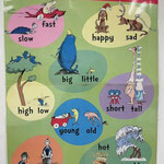 Now we move onto using them to describe things. Students are shown a series of pictures. They will then stand up and try to use adjectives to describe the picture. We encourage students to try and create more complex sentences than simply saying, ‘I see a boy,’ etc.