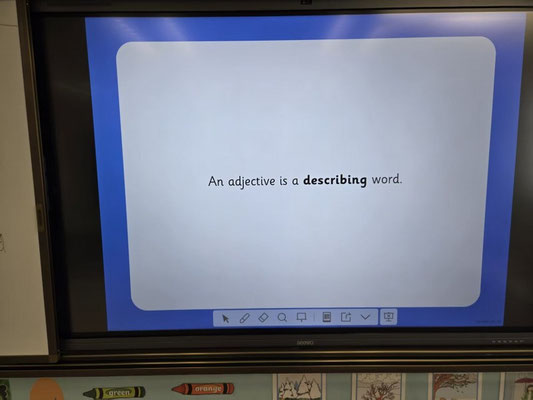 In LELS.2, we start off by showing students a video about adjectives. This gives them some ideas about what an adjective is. Then, we work through a powerpoint presentation, showing them how adjectives work in sentences.