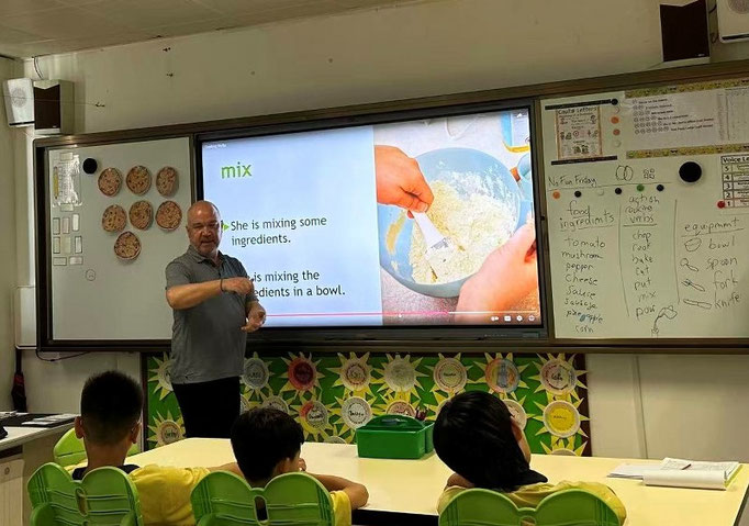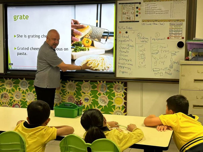 We used a Total Physical Response (TPR) exercise to reinforce the cooking verbs. The teacher would say: "Show me CUT! Show me MIX! Show me SPREAD!" and students performed the actions to review the key cooking verbs.