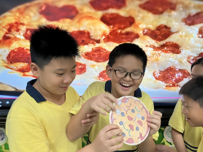 Our young chefs began by mastering food, cooking and kitchen vocabulary. We learned how to make a pizza to explain the different food ingredients, cooking verbs like cut, chop, slice, put, add, spread and kitchen equipment like oven, knife, cutting board and oven tray. Students needed to work in groups to create their own personalized pizza.